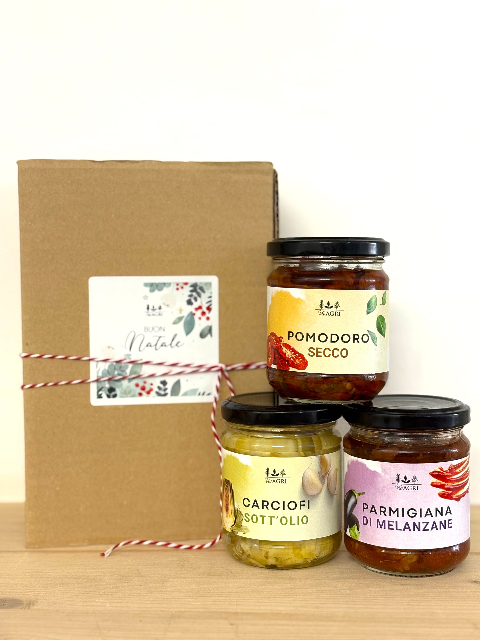 Il box Sapori di Sicilia ti porta in tavola tre sapori che raccontano la nostra isola: parmigiana di melanzane, carciofi sott’olio e pomodoro secco.