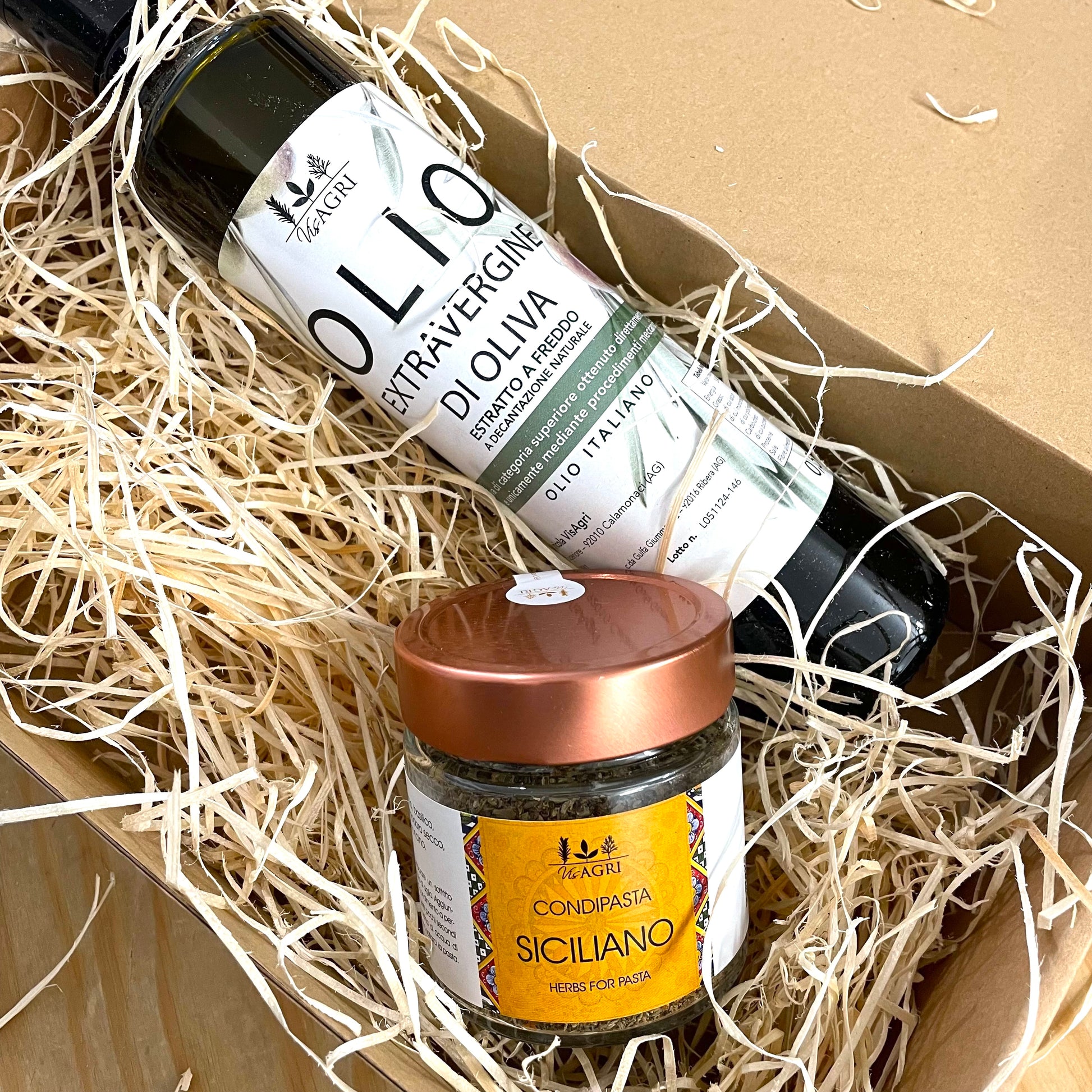 Olio e fantasia è composto da una bottiglia di olio extravergine di oliva da 0,5 L e da un barattolo di mix aroma siciliano da 50g, autentico appunto, perché rappresenta alla perfezione il nostro territorio nei profumi e nell'aroma.