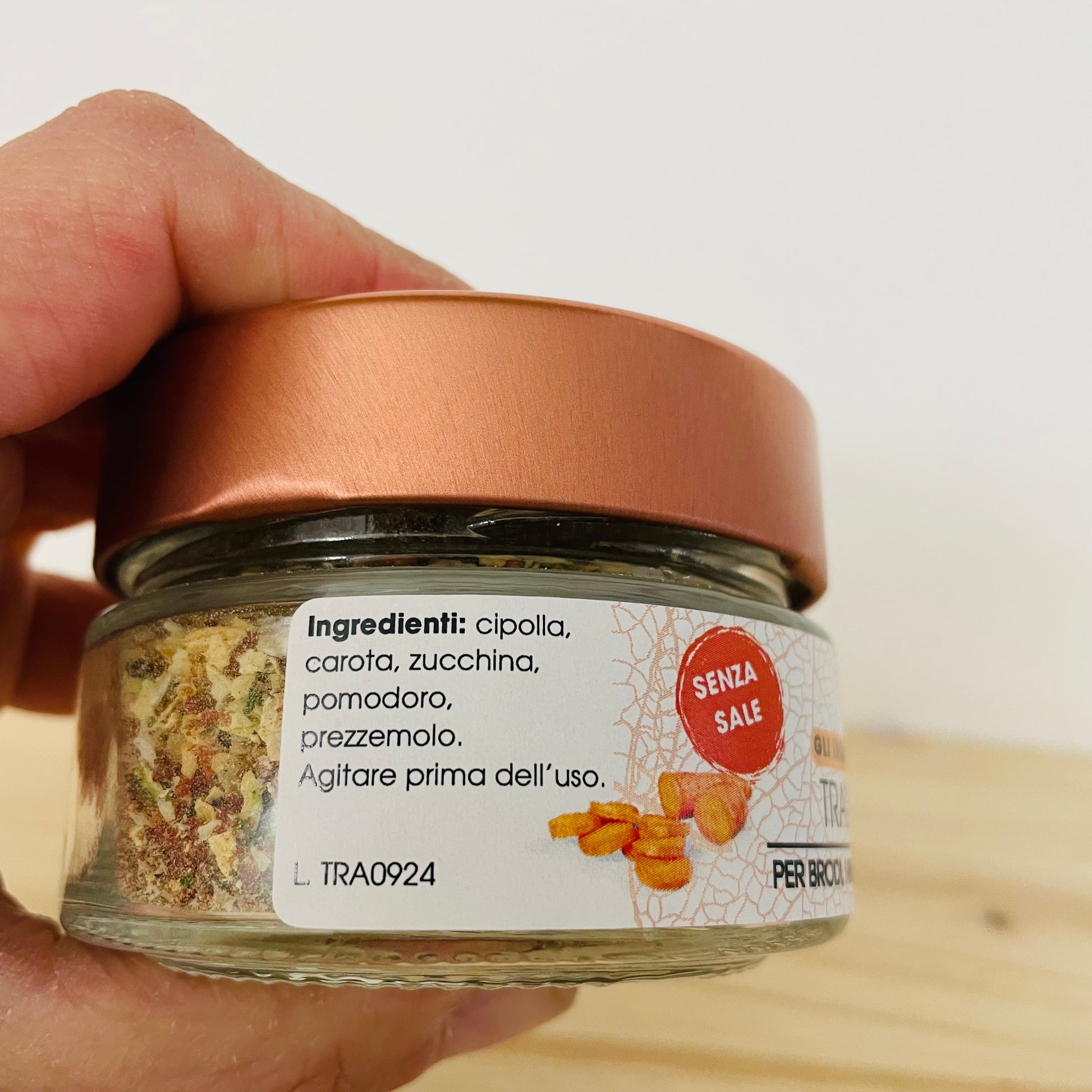 A base di cipolla, carota, zucchina, pomodoro e prezzemolo, questo mix è ideale per esaltare il sapore di brodi, minestre, soffritti e verdure.